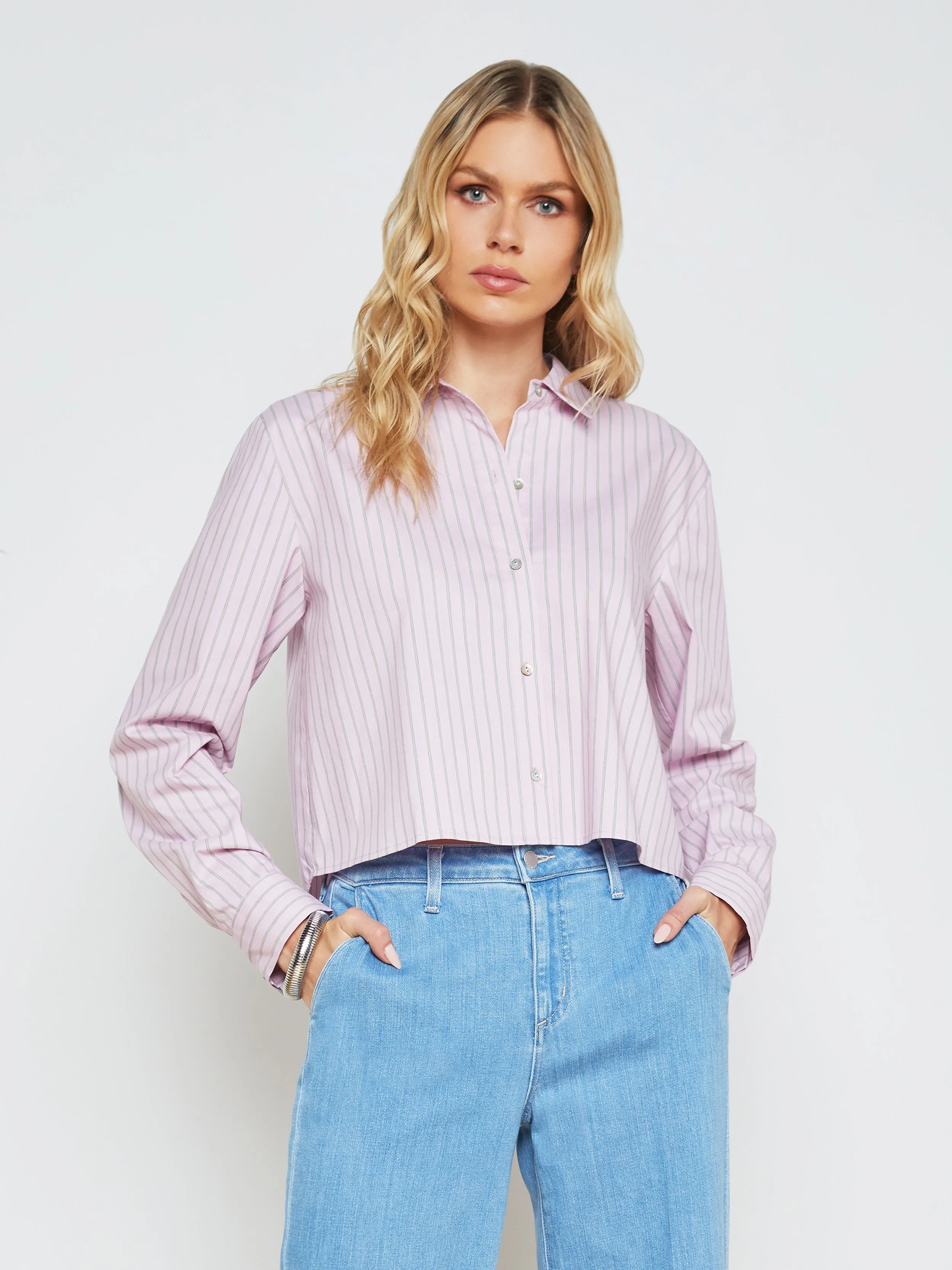 Breezy, effortless—introducing our newest take on a classic striped shirt. In a relaxed fit, the button-front Cosette features a cropped high-low silhouette with back-split shirttail hem that offers secure coverage while adding a unique jacket spin. Sharp collar and long button-cuff sleeves add tailored crispness. Perfect with high-rise denim.